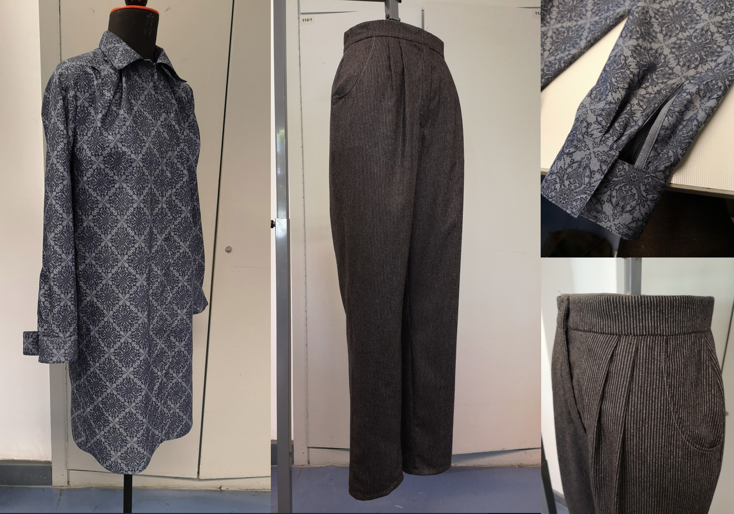 Specialized in industry-standard construction methods including pleated pants with straight waistbands and shirt dresses with classic yokes.