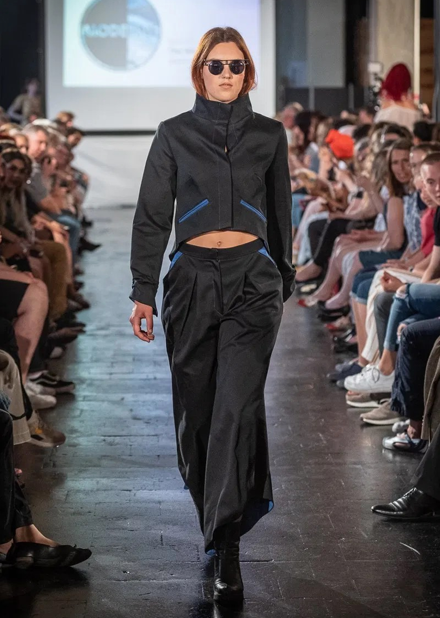 Key innovations: Linear design with black main color and blue accents, magnetic button closures to unite form and function, wide cuts balanced with precise tailoring techniques.